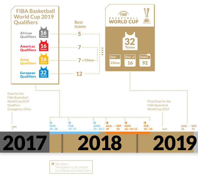 Starting in November when FIBA's Competition System 2017+ tips off, national teams will play regular home and away games to qualify for the FIBA Basketball World Cup 2019.