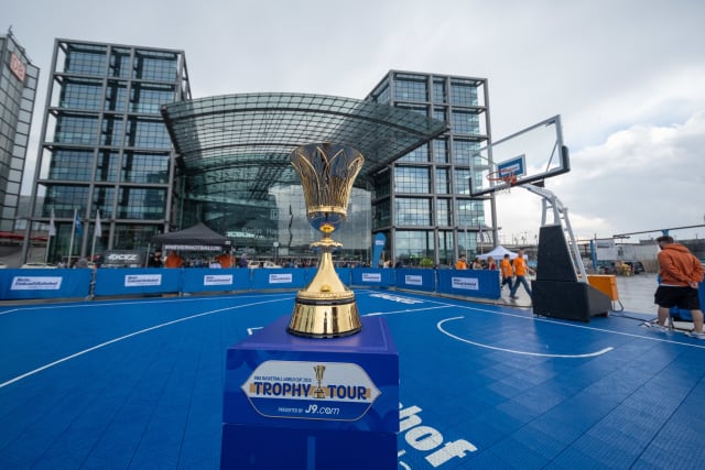 Soon after arriving in Berlin, the Naismith Trophy was taken to the Europaplatz, the main railway station that doubles as a mall. It was then photographed outside where a 3x3 tournament had been organized.