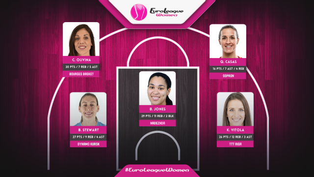 The frontcourt is rounded out by 'Ms Double-Double', Brionna Jones, as she racked up her 10th double-double in as many games, leading Nadezhda to a stunning comeback at ZVVZ USK Praha. Down by 17 points, the Russian side forced double overtime and took home a 90-86 win, behind 29 points, 11 rebounds and 2 blocks from Jones.