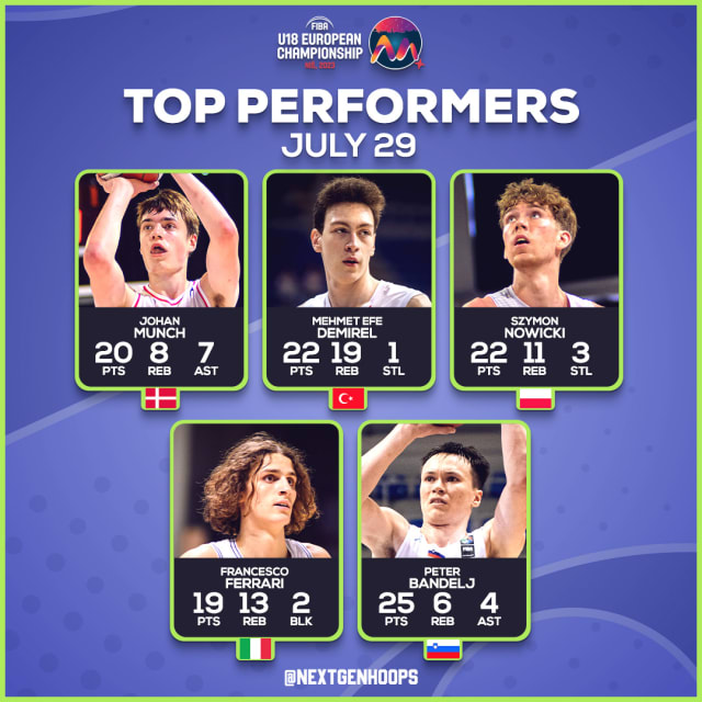 The top performance of the day came from Johan Munch, who registered an efficiency of 32 in Denmark's crucial Classification 13-16 win. He collected 23 points on 10-of-16 shooting and 1-of-2 free throws, 8 rebounds, 7 assists, 1 steal and 2 blocks against Finland.
