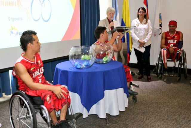 Colombian players assist IWBF Secretary General Maureen Orchard with the draw for the 2017 IWBF Americas Cup which will start August 21 in Cali, Colombia. Photo courtesy of IWBF