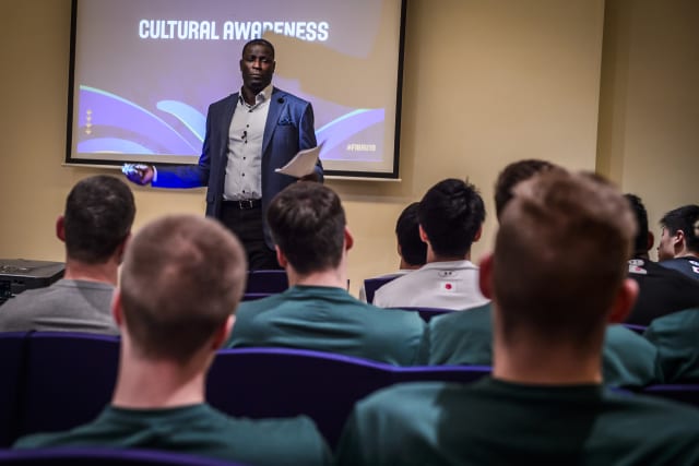 Oyedeji, meanwhile, talked with the players about cultural awareness and professionalism. He urged them to leave their comfort zone to be successful; learn a language; adjust to new cultures and not have them adjust to you. He emphasized always being positive and displaying confidence and shared one of his philosophies: "Share the ball, share the blame, share the glory."