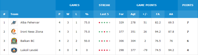 Balkan BC v Ironi Ness Ziona (H2H: Ness Ziona +27, 100-73) Lukoil Levski v Alba Fehervar (H2H: Alba +33, 89-56) [/unordered]Permutations