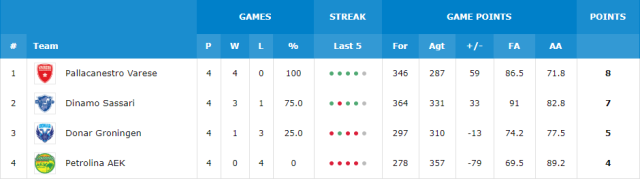 Pallacanestro Varese have already qualified for the Round of 16; Dinamo Sassari have already qualified for the Round of 16; Donar Groningen are no longer in a position to contend for a top-two finish in the standings; Petrolina AEK are no longer in a position to contend for a top-two finish in the standings. [/unordered]Group L