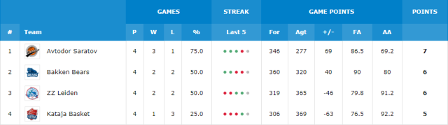 Avtodor Saratov would secure a top-two finish in the standings with a win; Bakken Bears would secure a top-two finish in the standings with a win, providing Avtodor Saratov beat ZZ Leiden; ZZ Leiden would no longer be in a position to contend for a top-two finish in the standings if they lose and Bakken Bears beat Kataja Basket; Kataja Basket would no longer be in a position to contend for a top-two finish in the standings if they lose. [/unordered]FIBA