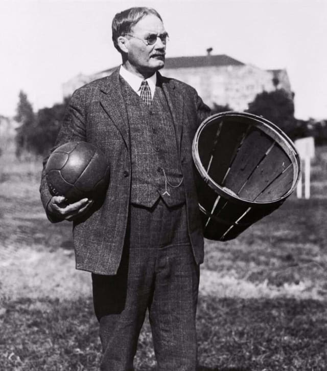A 30-year-old James Naismith, at the International YMCA Training School in Springfield, Massachusetts, introduced the first game of basketball. Using the 13 rules he'd created, two teams of nine players each competed against each other with players attempting to throw a soccer ball into a peach basket that had been attached to a balcony 10 feet above the floor.