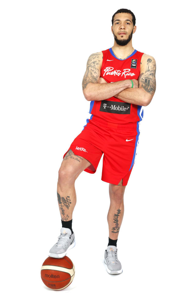 Andújar's commitment to this team is complete. One day before the first game, he's one of the only six players that come to a voluntary practice session of the group. With a solid muscle build and tattoos that are exposed thanks to his sleeveless "Puerto Rico Basketball" shirt, Emmy's there, warming up his muscles with a massage gun in front of 10,500 empty seats that overlook his training session. He looks up, breathes in the dense air of the Roberto Clemente Cathedral. This is real.