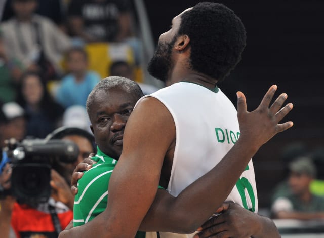 Ayo Bakare celebrates with Ike Diogu at the 2012 FIBA Olympic Qualifying Tournament
