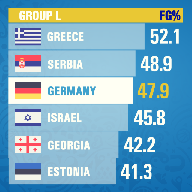 Germany are deadly from deep, nailing 40.4% of their threes. Only Lithuania match this clip and no other European team shoots over 40%. But the Germans are not overly reliant on outside scoring. Their 23.5 attempts from behind the arc per game ranks just 20th in the region. Impressively the 9.5 they hit ranks fifth out of the same group.