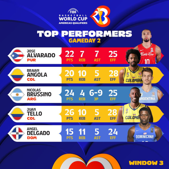 MIAMI (United States) - Colombia advanced to the Second Round of the FIBA Basketball World Cup 2023 Americas Qualifiers behind Braian Angola and Juan Tello, who headline the final Window 3 Top Performers.
