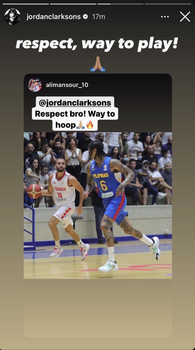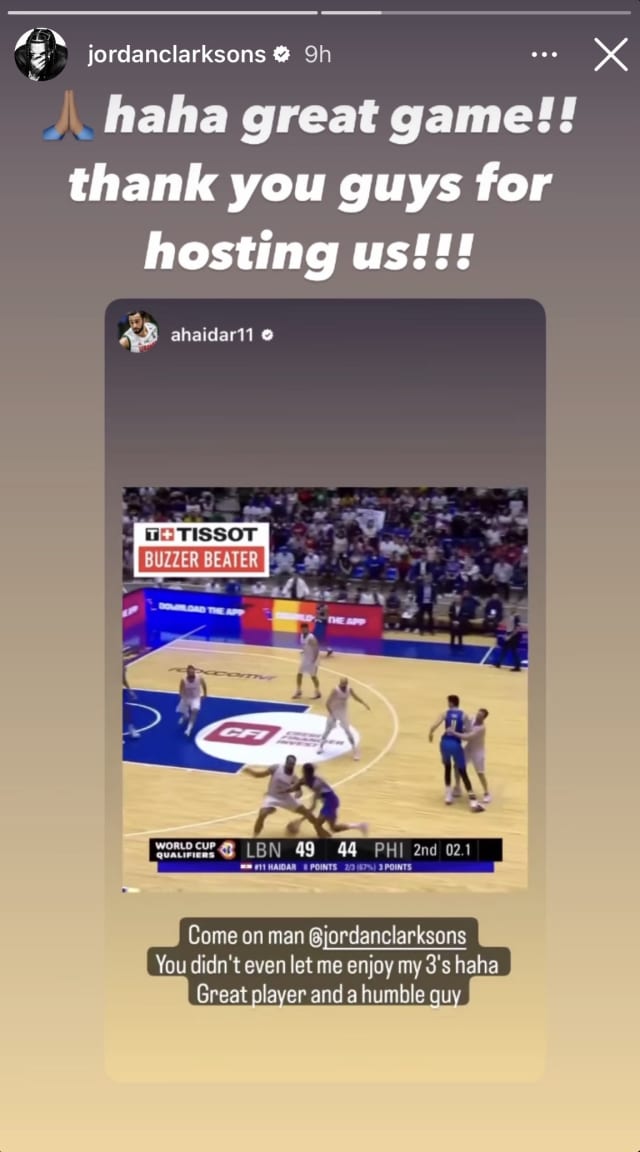 "Come on man, @jordanclarksons. You didn’t even let me enjoy my 3’s haha . Great player and a humble guy" read the text in the Instagram story of Ali Haidar who shared the highlight of his and Clarkson’s back-to-back three-pointers to end the first half.
