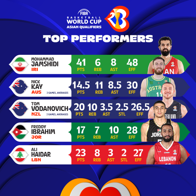 BEIRUT (Lebanon) - Mohammad Jamshidi led the individual performers in the first half of Window 2 in the FIBA Basketball World Cup 2023 Asian Qualifiers with 41 points.