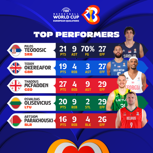 MUNICH (Germany) - Thaddus McFadden and Osvaldas Olisevicius both recorded efficiency valuations of 29 to highlight the individual performances from Gameday 1 of the FIBA Basketball World Cup 2023 European Qualifiers.