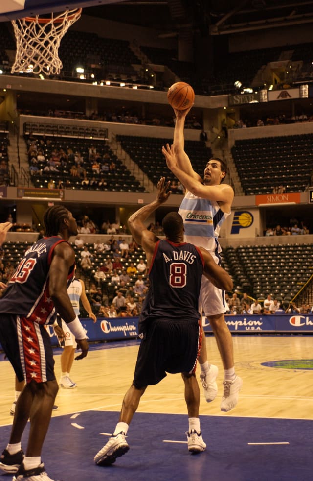 On August 29, 2002, 22-year-old Luis Scola suited up for Argentina's senior team in a competitive game for the first time at the 2002 World Cup in Indianapolis and had 14 points and four rebounds in a 107-72 triumph over Venezuela. Scola (seen above in Indianapolis facing the USA), had 14 points and four rebounds and also blocked a shot. After reaching the Final, Argentina fell to Yugoslavia in overtime but claimed Olympic gold two years later in Athens. Scola retired from the national team after playing at the Tokyo Games in 2021.