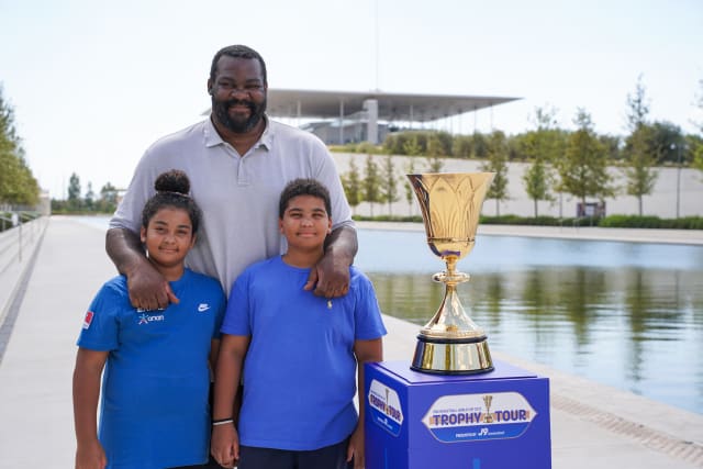 Schortsanitis and his two children with the trophy in front of the Stavros Niarchos Foundation Cultural Center