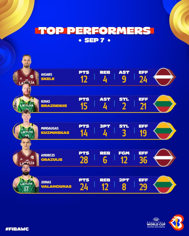 MANILA (Philippines) - Latvians and Lithuanians decided to fill out the daily Top Performers list before they battle it out in a Baltic derby on Saturday to decide the fate of the 5th place.