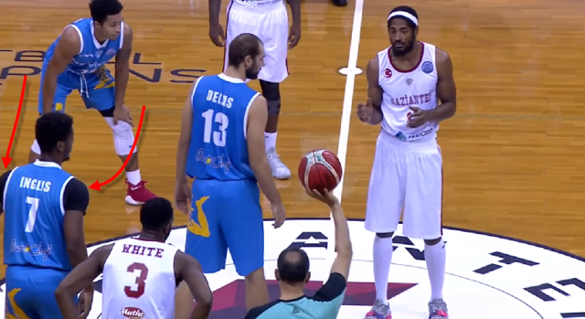During a rebound situation whilst jumping in the air, 22 White contacts 9 Red in the face with his extended arm but the referees did not call the contact as a foul. Error by the referees.