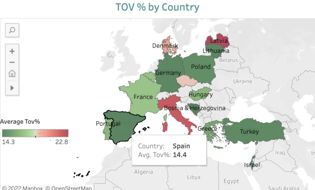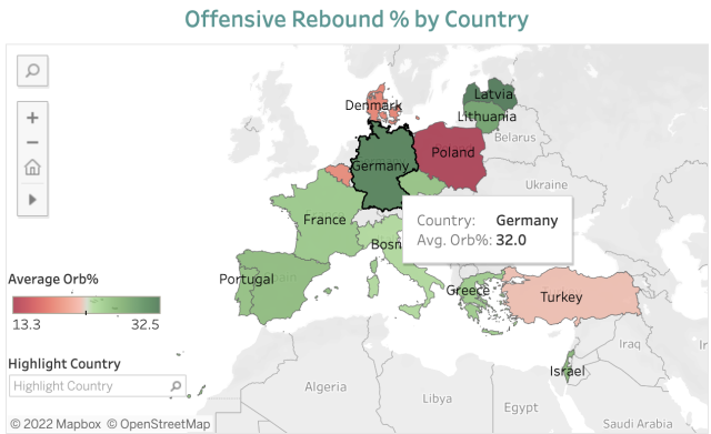 The next two maps we see on the "Possession" tab show us the way teams take care of their possessions with Turnover Percentage and the way they extend possessions with Offensive Rebound Percentage. When it comes to crashing the glass, we see VEF Riga representing Latvia and pulling down 32.5 percent of their misses but after that, the same two countries are in the top five. German clubs are pulling down 32 percent, whilst Spanish clubs are a close fourth at 26.4, with Rytas Vilnius sandwiched in third at 29 percent.