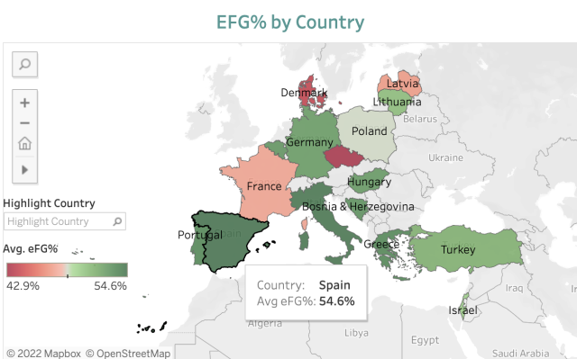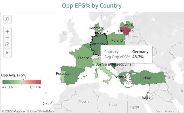 The data viz above has five tabs; "Efficiency", "Possession", "eFG%", "3-Point Shooting", and "Pace". Starting with the first tab we can see each team in the Basketball Champions League on a scatter plot for Defensive Rating (points allowed per 100 possessions) and Offensive Rating (points scored per 100 possessions). The y-axis for Defensive Rating is inverted as the lower the number, the more efficient a team has been on defense. The top right of the chart is where we see teams that have been efficient on both ends. We can also see below a map chart with an average Net Rating (Offensive Rating minus Defensive Rating) for all the teams from each country. What we can already see is that Germany's MHP Riesen Ludwigsburg is the most efficient team thus far with an absurd Net Rating of +34 points per 100 possessions across their first two games. After that, we see three Spanish clubs; BAXI Manresa (+22.8), Surne Bilbao (+21.6), and Unicaja (+21.2). We could probably expect that having three teams in the top five might ensure that Spain is the country with the highest average Net Rating but thanks to Ludwigsburg and Telekom Baskets Bonn also having +7 Net Rating, Germany holds the top spot so far with their teams coming in at +20.7 Net Rating.