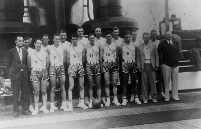 The first USA Olympic basketball squad; Lubinas is back row, third player from left