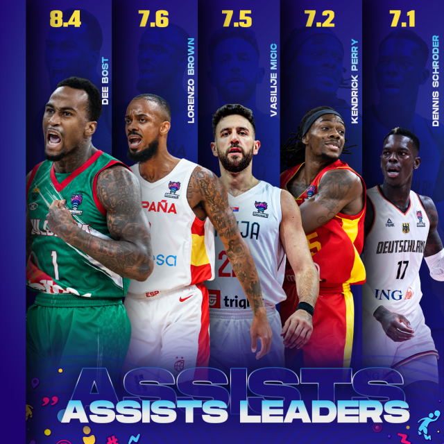 Another Bulgarian at the top of the stats category with Dee Bost leading the tournament in assists after dishing out 8.4 per game in the Group Phase. Lorenzo Brown handed out 11 assists in the Final for Spain and jumped up into second spot, ahead of Serbia's Vasilije Micic, while Dennis Schroder rounds out the top five behind Kendrick Perry.