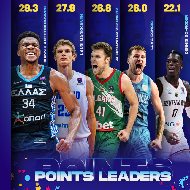 Giannis Antetokounmpo held onto top spot in the scoring charts with just under 30 points per game for the tournament. Finland's Lauri Markkanen rose to second after an explosive 43-point performance in the Round of 16 with Dennis Schroder climbing into the top five after leading Germany to a bronze medal with 25+ points in their last three outings.