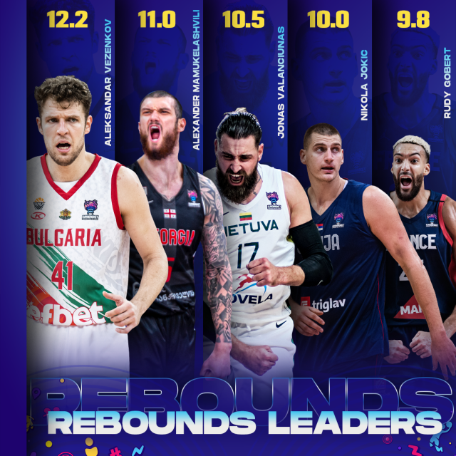 Aleksandar Vezenkov did not make it to Berlin with Bulgaria, but his 12.2 boards per game from the Group Phase were enough to hang on to first place in the rebounding averages. It was the same for Georgia's Alexander Mamukelashvili who moved up into second without playing, while Jonas Valanciunas and Nikola Jokic also maintained their double digits average.