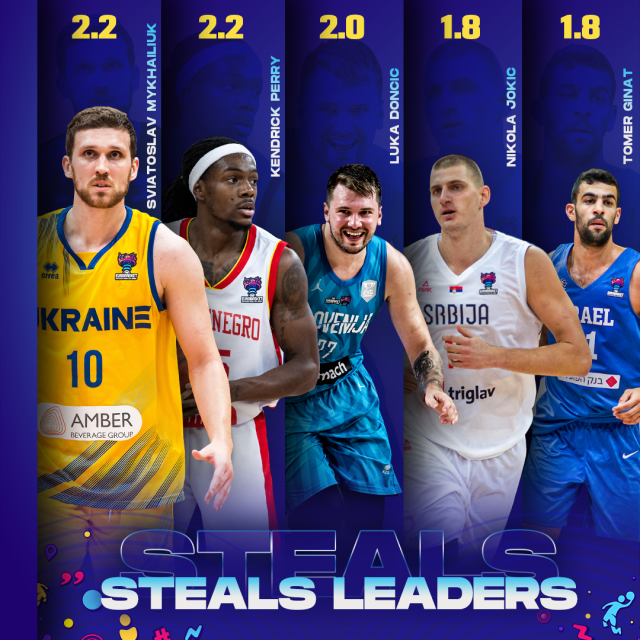 Svi Mykhailiuk and Kendrick Perry could not be separated in the steals department with 13 apiece at 2.2 per game with Slovenia's Luka Doncic also making it to at least 2 steals per game. Big men Nikola Jokic of Serbia and Israel's Tomer Ginat complete the top five with both finishing the tournament with 1.8 steals per outing.
