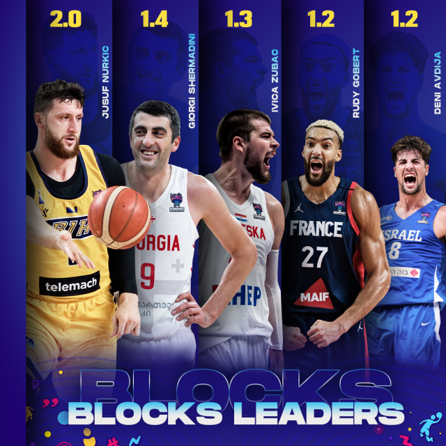 Bosnia and Herzegovina's Jusuf Nurkic remained top of the blocks after producing 2.0 rejections per game during the Group Phase. Giorgi Shermadini was a distant second for Georgia, just ahead of Croatia's Ivica Zubac. Silver medalist Rudy Gobert had 1.2 blocks per game alongside Deni Avdija of Israel.