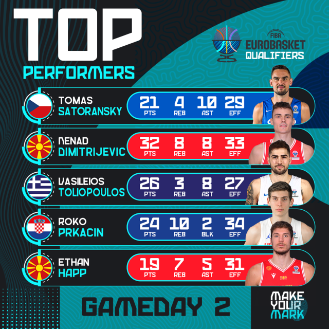 He wasn't the only player from North Macedonia to get a mention in this list. Nenad Dimitrijevic was unstoppable, setting a new scoring mark in the FIBA EuroBasket 2025 Qualifiers with 25 points, while also grabbing 8 rebounds and dishing out 8 assists. His efficiency was 33, the second highest on Monday.