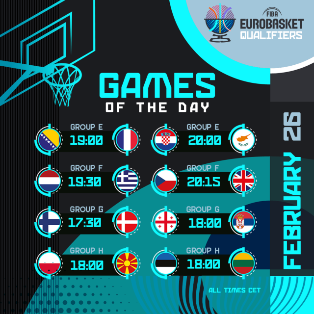 Denmark and Finland will get the action underway as the Danes look to keep their momentum going after starting the campaign with a huge win over Georgia, with Tornike Shengelia and Co. hoping for a bounce-back at home against group favorites Serbia.