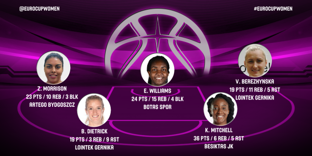 The lineup is rounded out under the basket by Artego Bydgoszcz's Ziomara Morrison and Botas Spor's Elizabeth Williams. Morrison accumulated a 23-point, 10-rebound double-double to lead Bydgoszcz to a valuable 72-66 away win at Basketball Nymburk.