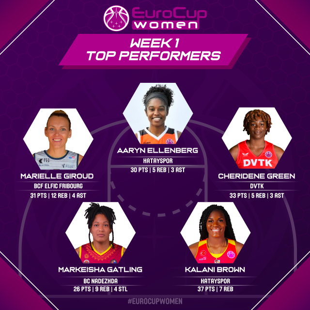 Just 24 hours later though Marielle Giroud took the honor of the best efficiency valuation of the first week after she excelled for BCF Elfic Fribourg as they beat Banco Sardegna Sassari 100-81. The Switzerland national team winger poured in 31 points, snapped up 12 rebounds and handed out 4 assists for an efficiency rating of 38.