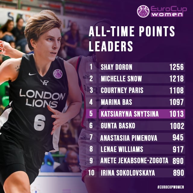 The 37-year-old veteran not only passed 1000 points in the competition this season, but also climbed into the top five of the all-time leading scorers. Snytsina is now part of the London Lions in giving the British side some valuable experience on the European stage. The Belarusian has also won a medal at international level in 2007 and played across Europe for clubs in Turkey, Russia and Hungary with the sharpshooter a consistent performer with solid career numbers in EuroCup Women with a chance to climb higher up the leaderboard.