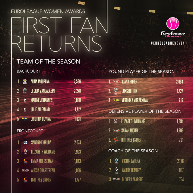 MUNICH (Germany) - The race to gain recognition in the EuroLeague Women Awards continues to heat up after confirmation of the first returns in the fan voting, with Alina Iagupova, Cecilia Zandalasini and Sandrine Gruda leading the Team of the Season ballot.