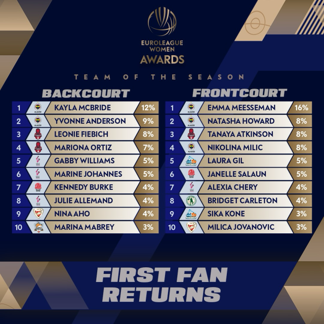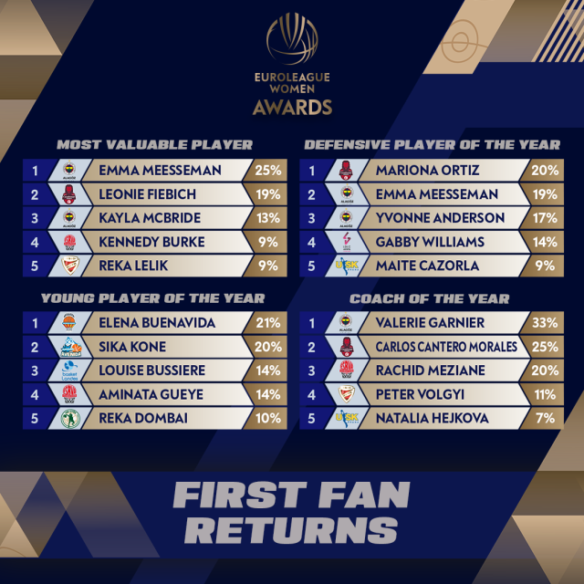 MUNICH (Germany) - The EuroLeague Women Awards first returns in this years fan voting show Fenerbahce Alagoz Holding and Casademont Zaragoza stars leading the Team of the Season race.
