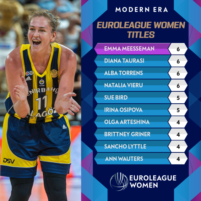 The Belgian ace has joined previous all-time leaders and megastars Diana Taurasi and Alba Torrens, as well as Natalia Vieru, who also have six on their resume. Meesseman won her first ever title in 2016 when playing alongside all three in the same UMMC Ekaterinburg team.