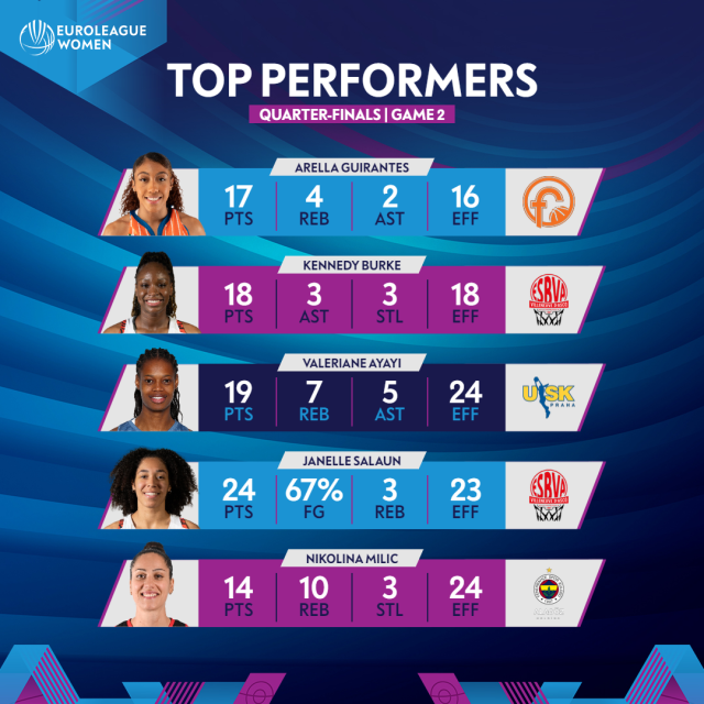 MUNICH (Germany) - There were a number of hugely influential and pivotal individual displays on a pulsating night of action in the second games of the EuroLeague Women Quarter-Finals.