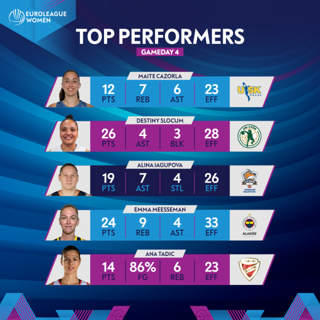 MUNICH (Germany) - There were some spectacular showings on Gameday 4 of the Regular Season with Belgian superstar Emma Meesseman bringing her best of the season for Fenerbahce Alagoz Holding, with many more fantastic performances elsewhere across EuroLeague Women.