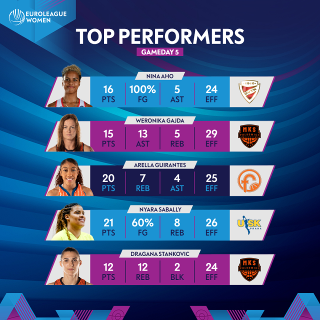 Weronika Gajda of KGHM BC Polkowice stepped away from Week 5 with the highest performance efficiency valuation after recording 29 in the pulsating 92-82 overtime win against Serco UNI Gyor. The guard handed out 13 assists which was more than any other player has managed in a game so far this season, while also harvesting 15 points, 5 rebounds and 2 steals.