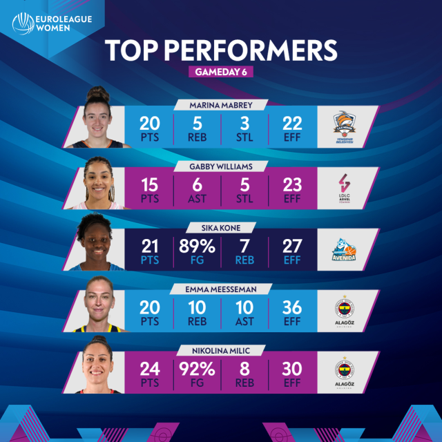 MUNICH (Germany) - The resumption of EuroLeague Women action after the international window brought a number of eye-catching individual performances right across across a number of Week 6 games.