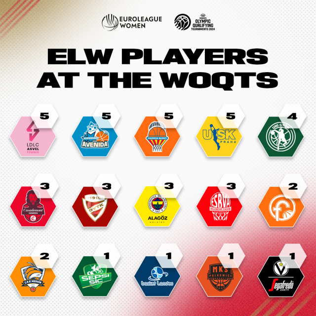 The quartet of LDLC ASVEL Feminin, Perfumerias Avenida, Valencia Basket Club and ZVVZ USK Praha will be represented by five players each at the Olympic Qualifying Tournaments, while Hungarian side Serco UNI Gyor will have four.