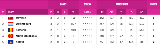 Day 4 results: Luxembourg coasted to another win as they took down Kosovo 91-57 thanks mainly to 19 points from Kim Sowa, with Agnesa Rrahmani replying with 20 points in defeat. The still perfect Slovakia dominated Romania 74-52 and moved to 3-0 in the standings..
