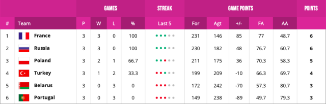 Day 4 results: Janelle Salaun's monstrous double-double paved the way for France to move to 3-0 as they strolled past Poland 71-54. Zeynep Gul posted 22 points as Turkey got rolling with a first win of the competiton as they breezed past Belarus 83-59. Meanwhile Russia had to work hard to see off Portugal, gaining a 66-60 triumph thanks to a 21-7 last period.