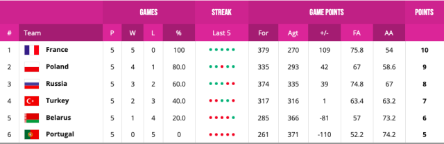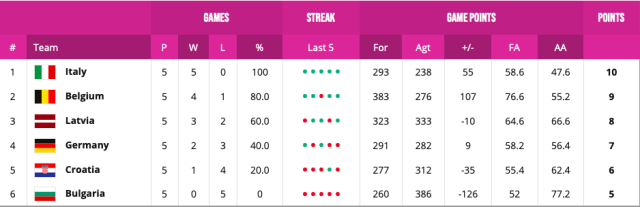 Day 7 results:  Italy finished the campaign without a loss to their name after winning 50-49 against Germany in a nail-biter although they only did so as their opponents missed two free-throws in the last second of the contest. Belgium soared past Croatia 77-37 in a one-sided matchup, while Latvia enjoyed a last day victory over Bulgaria with Paula Klescova leading them to a 74-58 success.