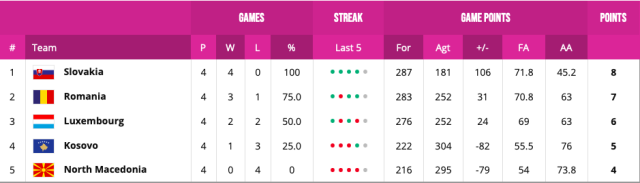 Day 7 results: There was elation for Kosovo who got off the mark at the last attempt as they won in dramatic fashion 63-62 against North Macedonia. Romania secured second place in Skopje after they beat Luxembourg 73-59 after an amazing double-double of Laura Vaida, who harvested a massive 21 points and 26 rebounds.