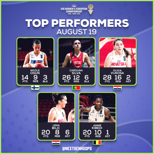Olivia Vukosa was the day's best performer as she registered 28 points and 16 rebounds for a 35 efficiency rating in Croatia's pivotal fifth-place win over Poland. The 1.94m teenager shot 11-of-20 from the field while adding 2 assists and 1 block.