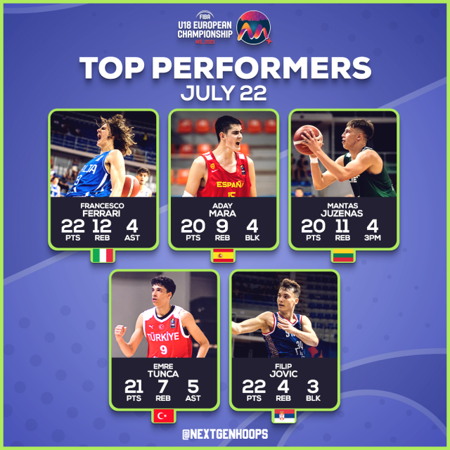 The highest efficiency (31) on opening day came from Italy's Francesco Ferrari after he finished with a 22-point, 12-rebound double-double plus 4 assists and 2 blocks. He also shot 6-of-11 from the field and 10-of-12 from the free-throw line in a five-point defeat to Greece.
