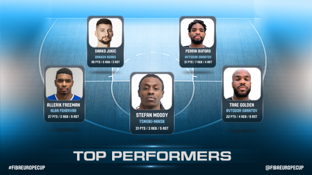 Only the sixth player to surpass the 30-point mark in a FIBA Europe Cup game this season, Stefan Moody paced Tsmoki-Minsk to an 84-73 win against Balkan Botevgrad with 31 points, 3 rebounds, 5 assists, and a steal and a block each.