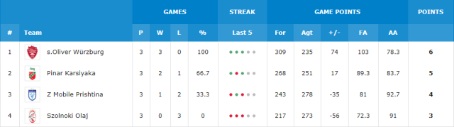 s.Oliver Wurzburg would secure a top-two finish in the standings with a win, clinching a Play-Off berth. No matter the results, the fate of Pinar Karsiyaka and Z Mobile Prishtina will not be decided this week in Group I. In case of a defeat, Szolnoki Olaj would no longer be in position to contend for a top-two finish in the standings. [/unordered]Group J